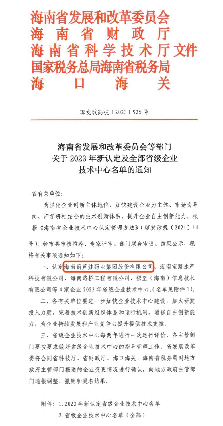 近日,海南省发改委等多部门联合公布了《关于2023年新认定及全部省级企业技术中心名单的通知》,其中,海南壹号娱乐药业集团股份有限公司成功通过评审,被认定为省级企业技术中心,是本次获批的4家企业之一。